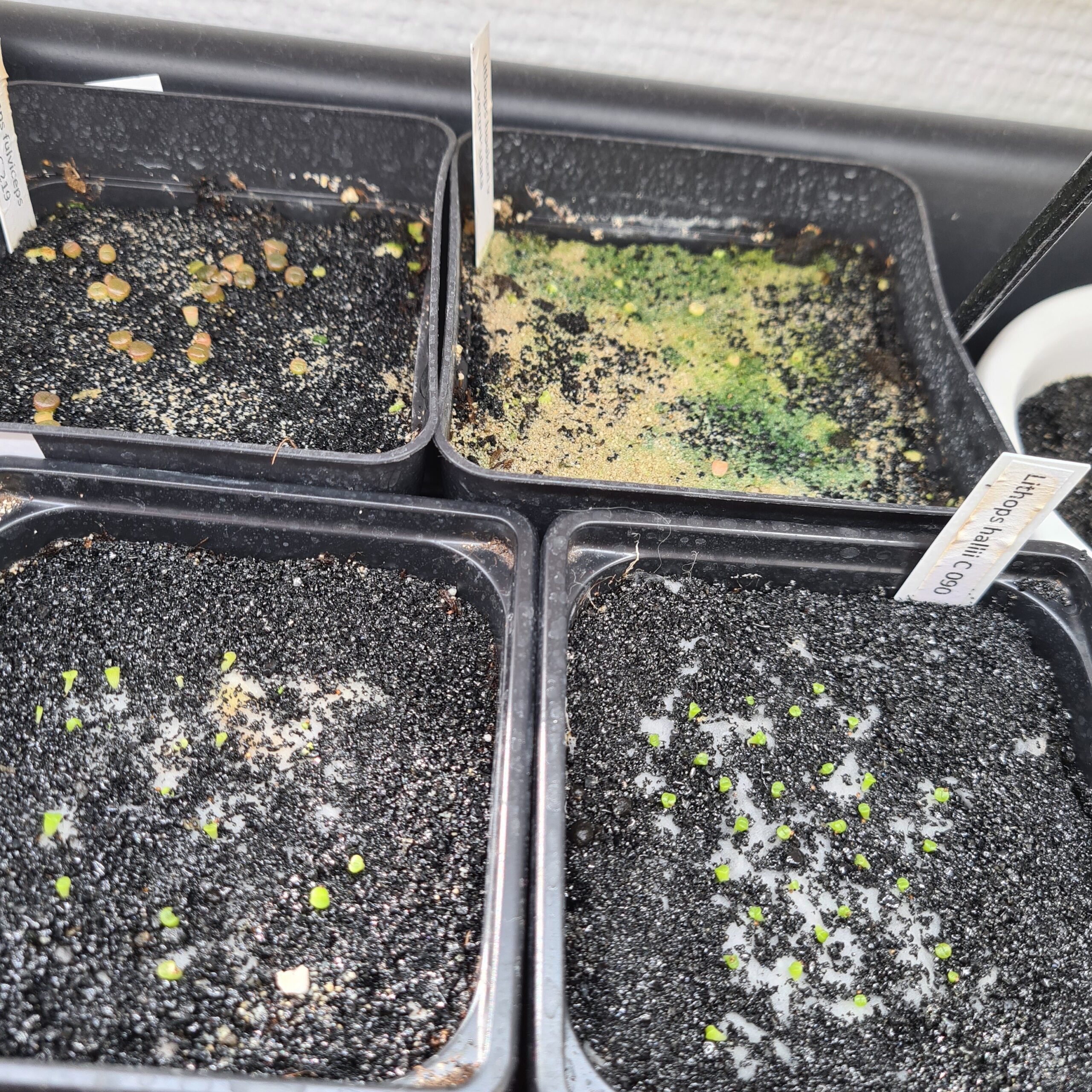 Potten fyldes med jord (halv så- og priklejord og halv grus) til ca 1,5 cm fra kant. Læg en fint lag sand ovenpå (kvartsand – el chinchillasand) så frøene ikke synker ned i jorden. Væd potten inden der såes. Fordel frøene, enten med tandstik hvis der er få, eller bland de små frø med lidt sand så de er nemmere at drysse jævnt ud. Pak potten ind i plastik, væksthus eller andet der holder på fugten. Hverdag skal potten have luft, gerne et par timer. Lithops/Lithops skal helst spirre ved stuetemperatur eller lidt højere, temperatuen må ikke komme under 20 grader. Planter som Conophytum foretrækker lidt lavere temperatur. Efter 5-10 dage vil de små spirrer kunne ses. Selvom ikke alle frøene er sprirret kan se sagtns spirre senere. Efter 14 dage drysser jeg lidt grovere grus så planterne har noget at støtte sig op ad. Pas på når der sprayes vand. Rødderne er ikke så lange endnu, så man kan næmt “spraye op” af jorden.