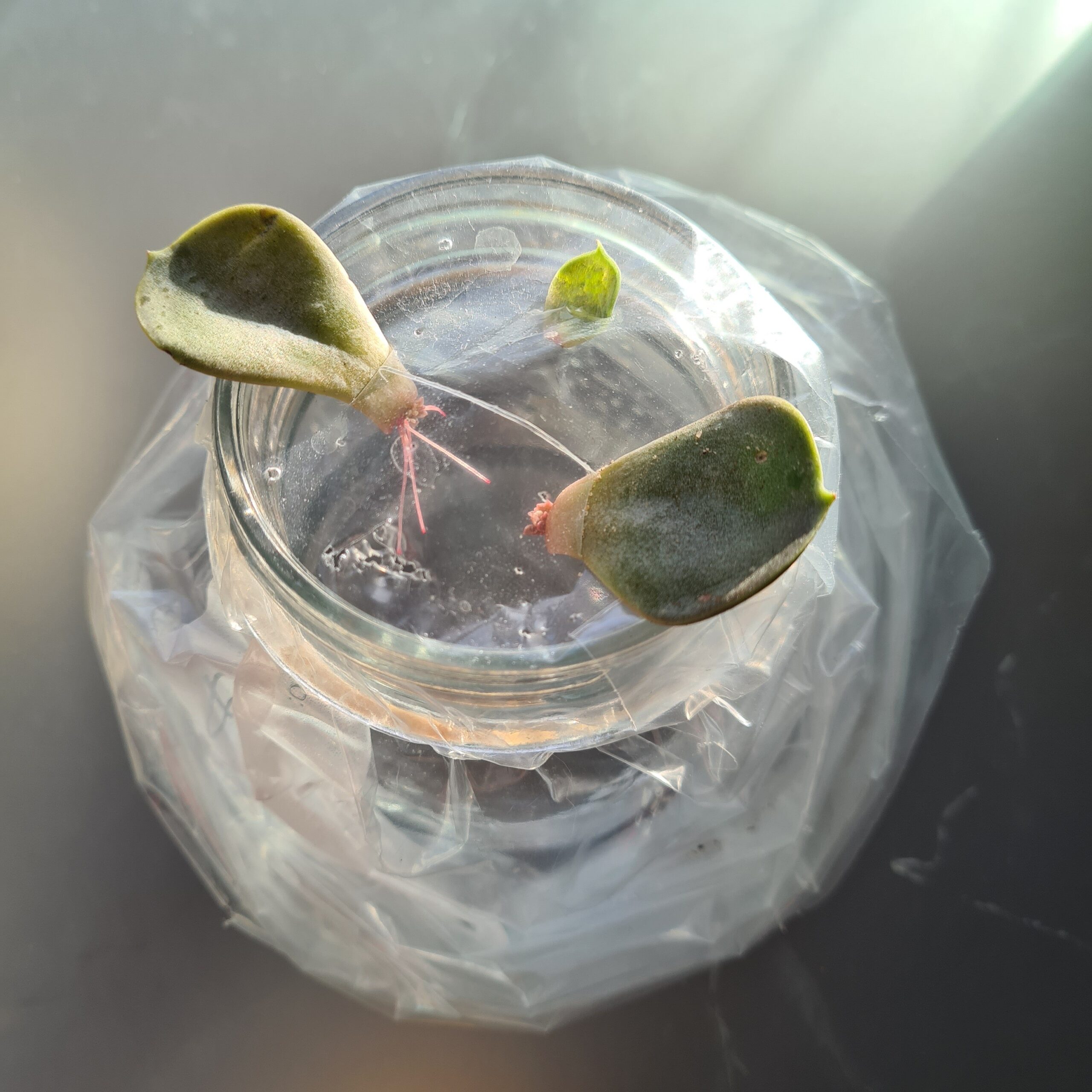 Fjen sunde blade nederst fra planten. Fyld 2-3 cm vand i et syltetøjsglas. Læg en klar plastikpose over toppe og forsegl med en elastik (jeg bruger en fryde pose. Klip et par huller så bladenderne kan stikkes i uden de ryger helt i gennem. Lav ekstra huller så bladenderne får luft. Derefter stilles glasset lyst, men ikke i stærk sol. Jeg stiller det i vindueskarmen i østvendt vindue. Efter ca 3 uger kan man begynde at se rødder. Hvis der er blade der rådner og klasker sammen skal de fjernes. Efter 4 uger kan man se de små planter vokse ud fra bladet. De skal vokse mindst en måned mere – til en størrelse på en 1-krone.